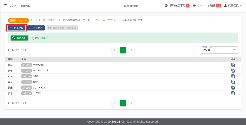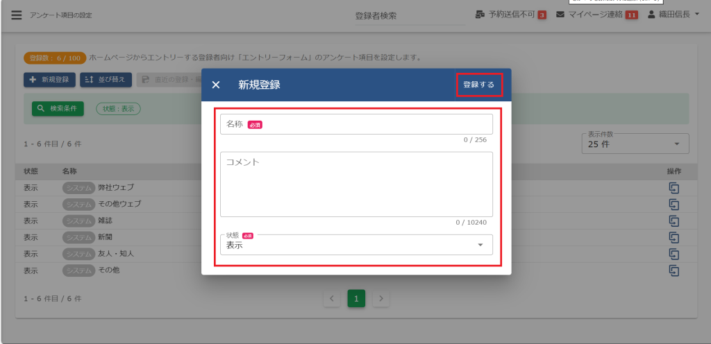 (4)回答を新規追加する場合は、[+新規登録]をクリック、[アンケートの回答名]テキストボックスに、アンケートの回答を記入し、[登録する]をクリックします。