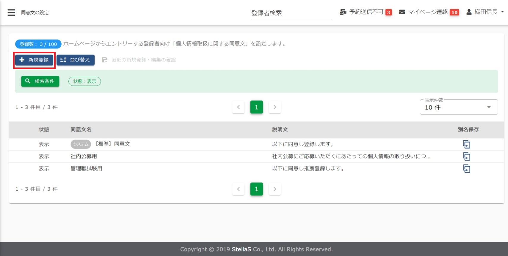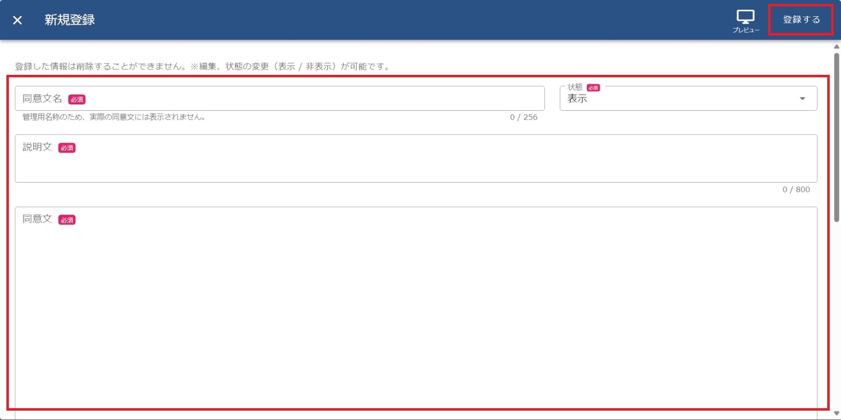 同意文を新しく登録する場合は[+新規登録]をクリック、必須項目を入力して[登録する]をクリックします。