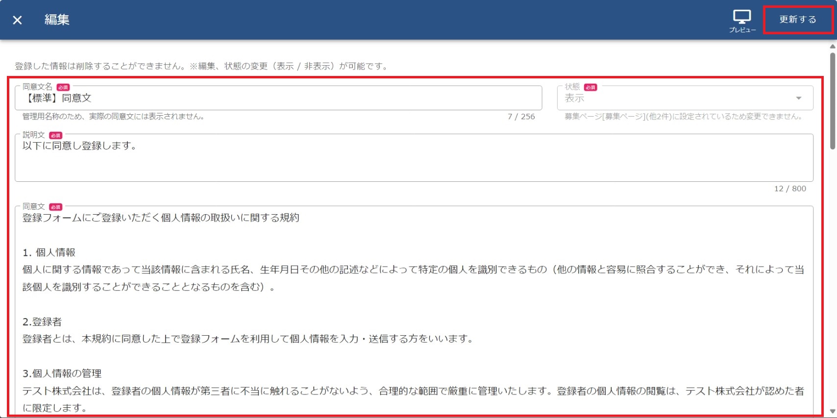 同意文は初期設定時に登録されていますが、必ず貴社にあった内容に変更してください。